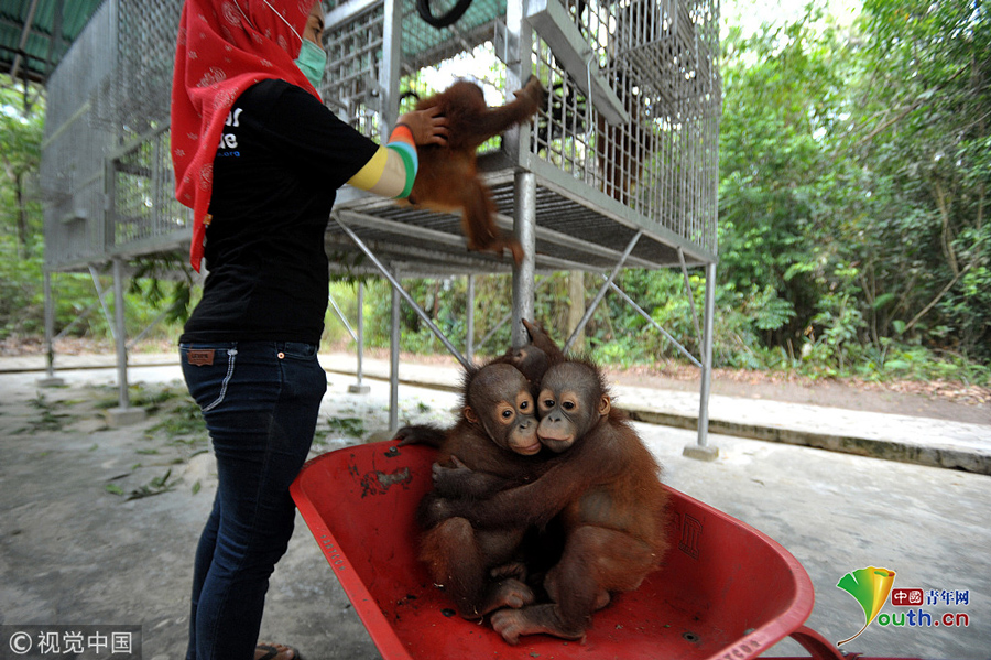 印尼加里曼丹克塔邦,國際動物救援(IAR)猩猩安全與保護(hù)中心里,飼養(yǎng)員用獨輪車把猩猩寶寶送到森林學(xué)校。圖片作者:Newscom