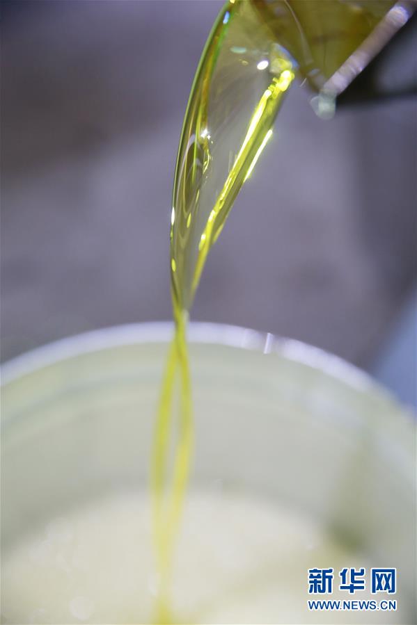 11月22日,在廣西柳州三江侗族自治縣斗江鎮(zhèn)一茶油加工點,新榨的茶油從榨油機流出。新華社記者任正來攝