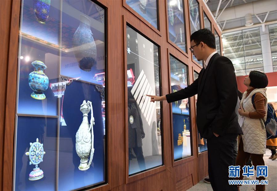 11月23日,兩位參觀者在“博博會”上觀看文創(chuàng)產(chǎn)品。新華社記者李賀攝