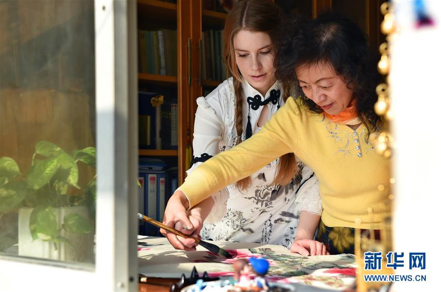 11月24日,在石家莊橋西區(qū)家中,艾米莉跟婆婆學(xué)習(xí)畫中國畫。 新華社發(fā)(張曉峰 攝)