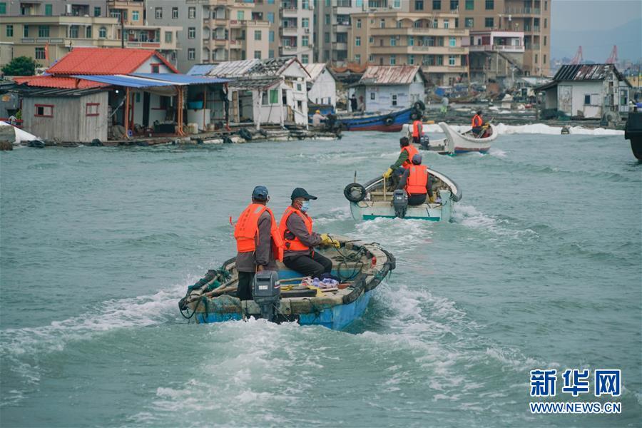 在福建省泉州市泉港區(qū)南埔鎮(zhèn)肖厝村附近海域,參加清理工作的人員駕船返回碼頭(11月6日攝)。新華社記者 宋為偉 攝