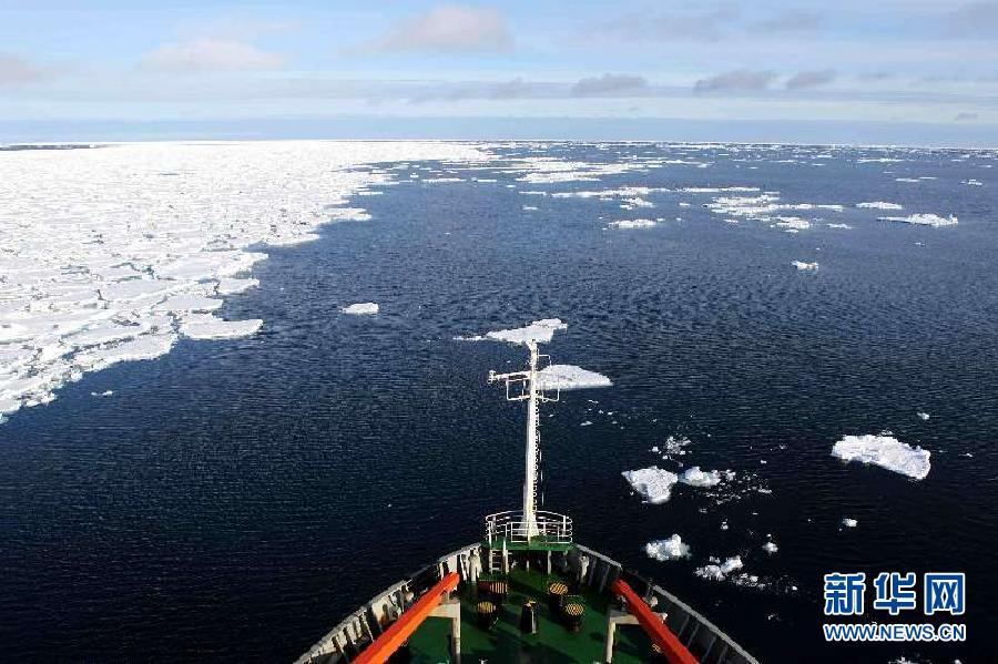 從“雪龍”號駕駛臺上放眼望去,浮冰鋪滿海面,時有冰山立于其間。“雪龍”號沿著浮冰間的空隙行進,碾過浮冰的撞擊聲不時從船底傳來。為減輕船體的震動,航速有所下降,由原來的每小時15節(jié)左右降為目前的每小時9節(jié)左右(1節(jié)約合每小時航行1.852公里)。