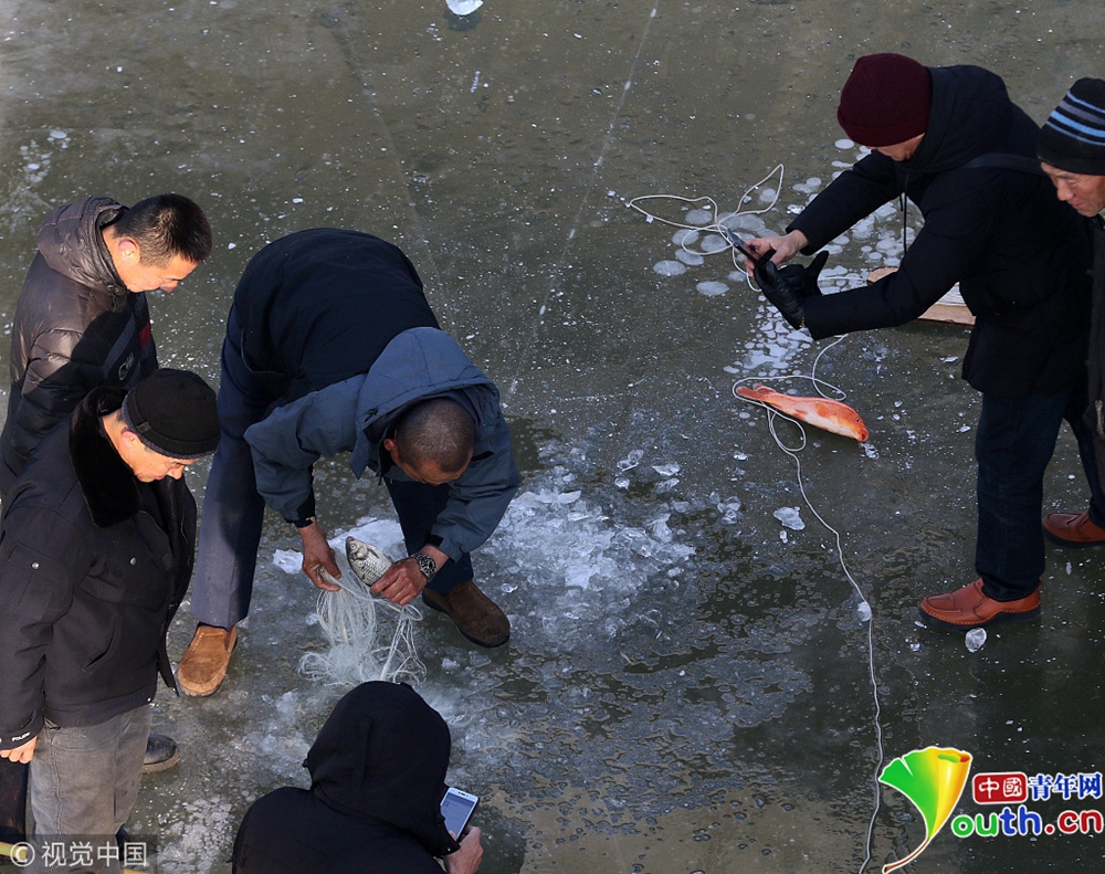 哈爾濱松花江封江 市民鑿冰捕魚