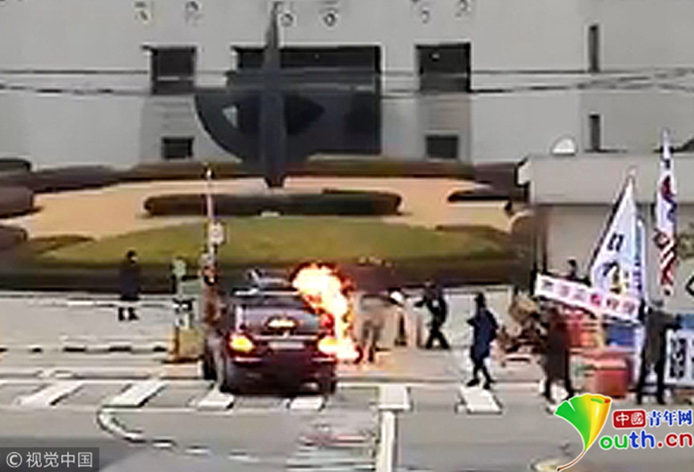 當(dāng)?shù)貢r間2018年11月27日,韓國首爾,27日上午9點10分,在首爾瑞草區(qū)的最高法院前面,一名74歲的示威男子向韓國最高法院院長金明秀所乘的車輛投擲燃燒瓶。副駕駛一側(cè)的前輪和示威男子身上均起火,所幸被現(xiàn)場警察迅速撲滅,金明秀未受傷。當(dāng)時,他正準備去上班。