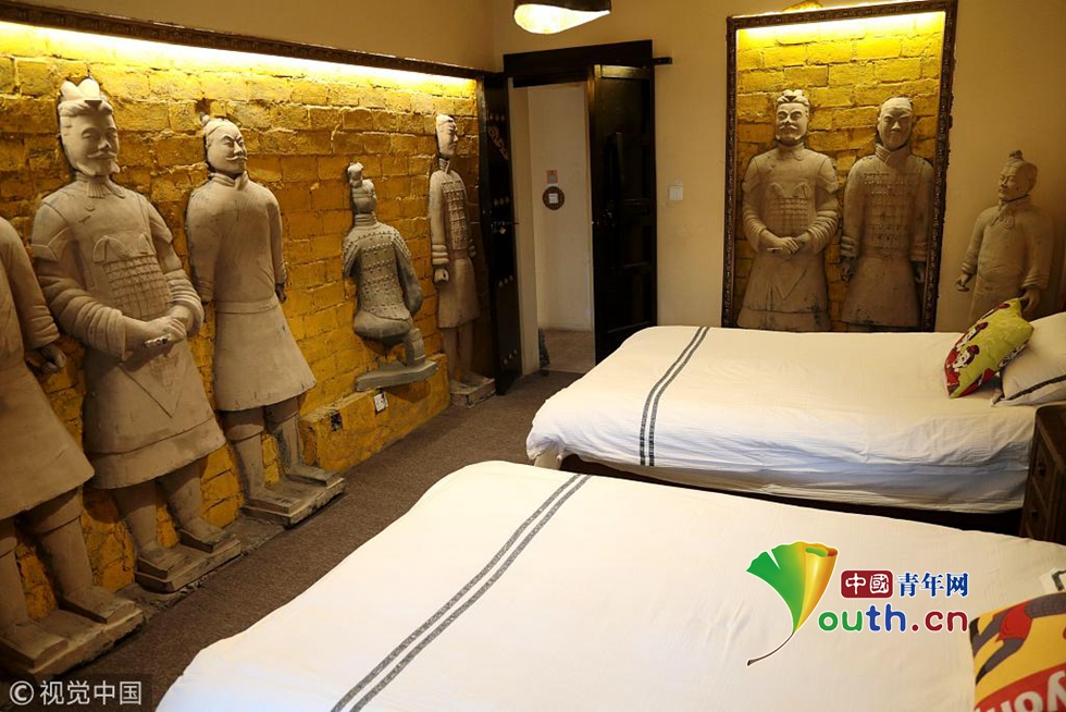 2018年11月27日,西安,民宿臥室內(nèi)的“兵馬俑”裝飾。近日,西安一家主打“兵馬俑”元素的民宿走紅,“兵馬俑”元素遍布在房間各個角落,“深情注視”著在此休憩的旅客,加上昏黃的燈光及復古的裝飾,讓不少旅客感嘆如同居住在“秦始皇陵”。 張遠(陜西分社)/視覺中國