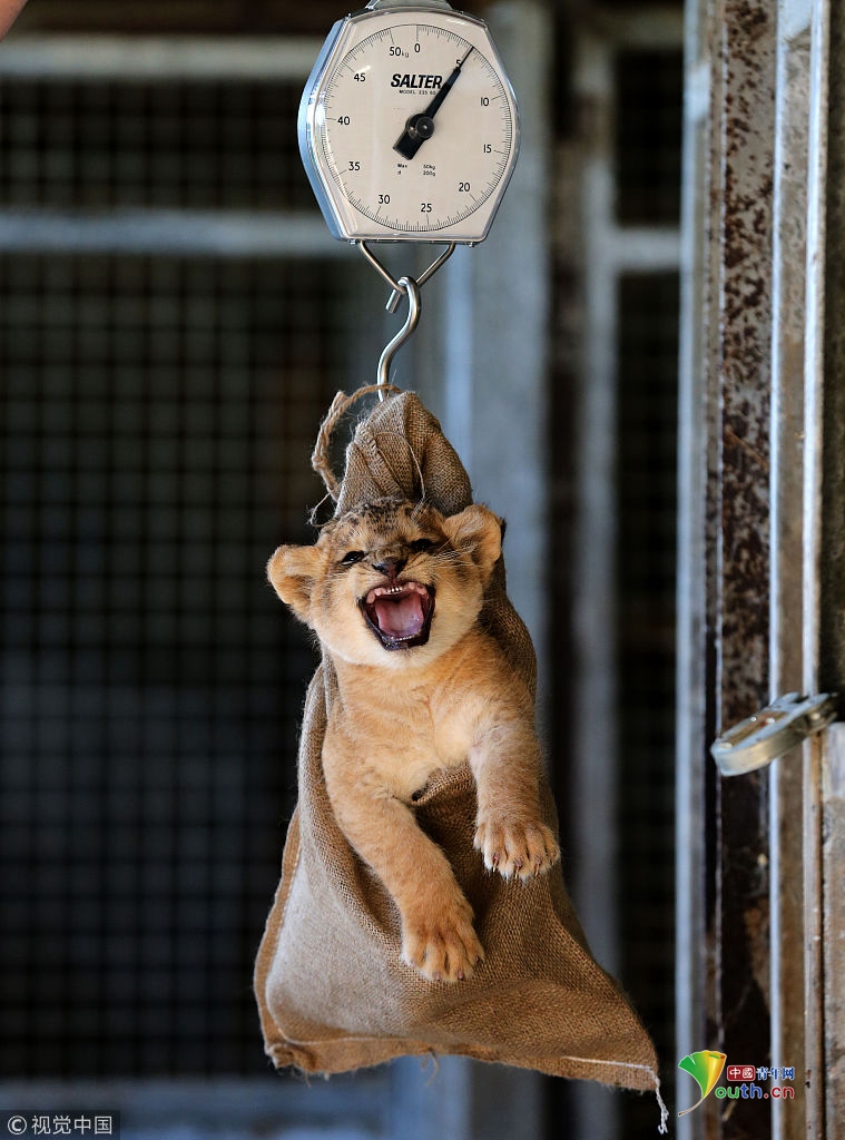 當(dāng)?shù)貢r(shí)間2013年10月10日,英國蘇格蘭斯特靈,Blair Drummond Safari野生動(dòng)物園一頭新生獅子幼崽進(jìn)行稱重。它僅有一個(gè)月大。