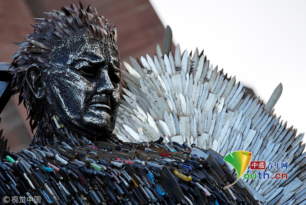 當(dāng)?shù)貢r(shí)間2018年11月29日,英國利物浦,藝術(shù)家阿爾菲·布拉德利在圣公會(huì)教堂外用沒收的10萬多把刀具制作了一尊名為“刀之天使”的塑像。