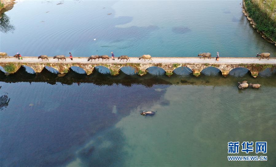 廣西百色靖西市新靖鎮(zhèn)鵝泉村村民從古老的石橋上趕?;卮澹?1月27日無(wú)人機(jī)拍攝)。