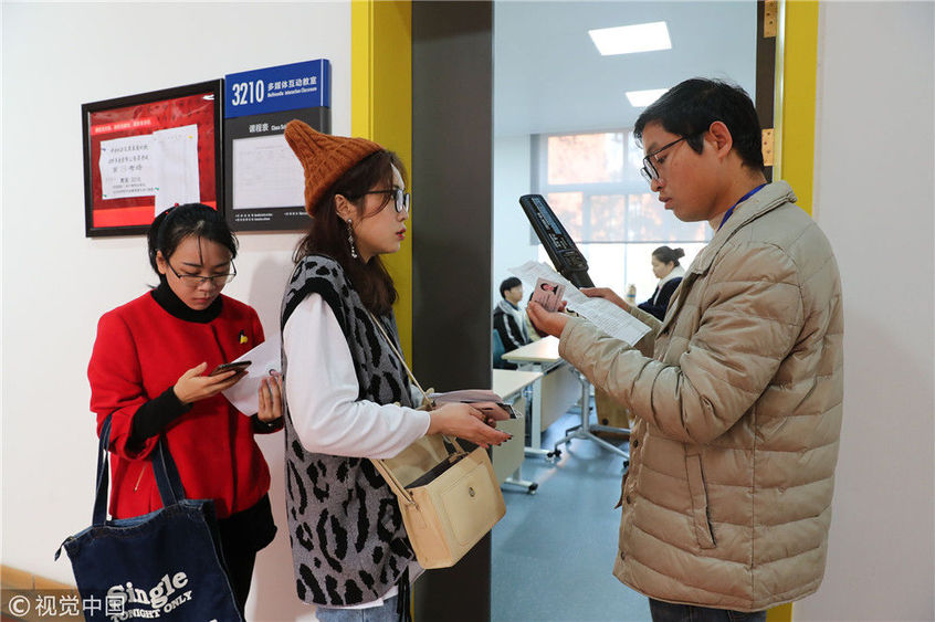 圖為2018年12月2日,浙江寧波,浙江萬里學(xué)院考點(diǎn),監(jiān)考老師在核對(duì)考生準(zhǔn)考證、身份證。張培堅(jiān)/視覺中國
