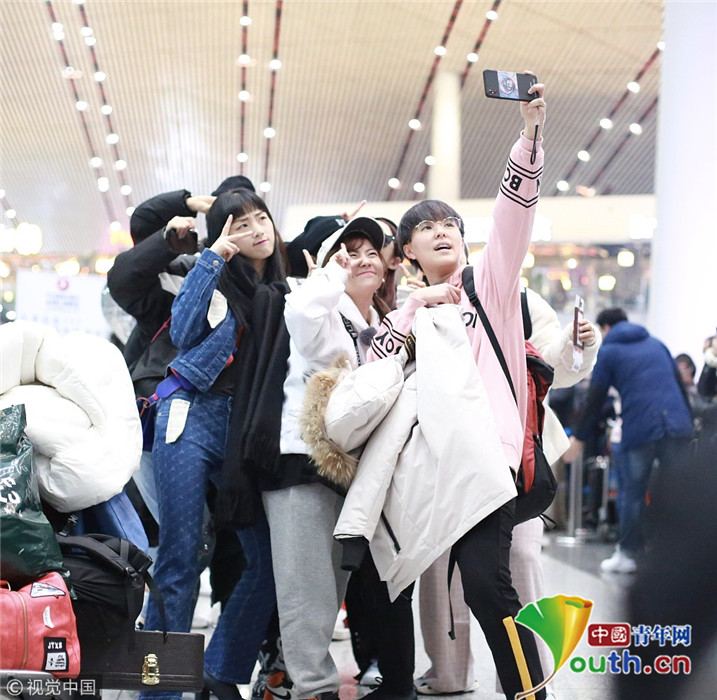2018年12月3日,北京,“火箭少女101”全體成員現(xiàn)身機場前往國外錄制團總綜。其中孟美岐戴著墨鏡,一身全黑運動裝扮,大步流星氣場超強,楊蕓晴、yamy、楊超越等成員緊隨其后,大家還一起在機場玩起自拍,好不歡樂。