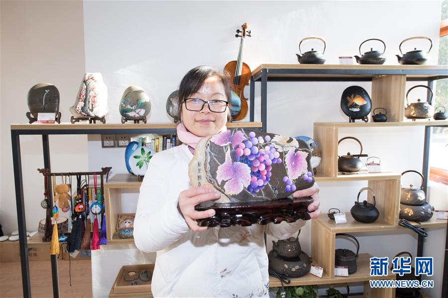 “農民畫家”陳蘇蘭在開設的工作室內展示創(chuàng)作的石頭畫《下姜葡萄》(1月10日攝)。