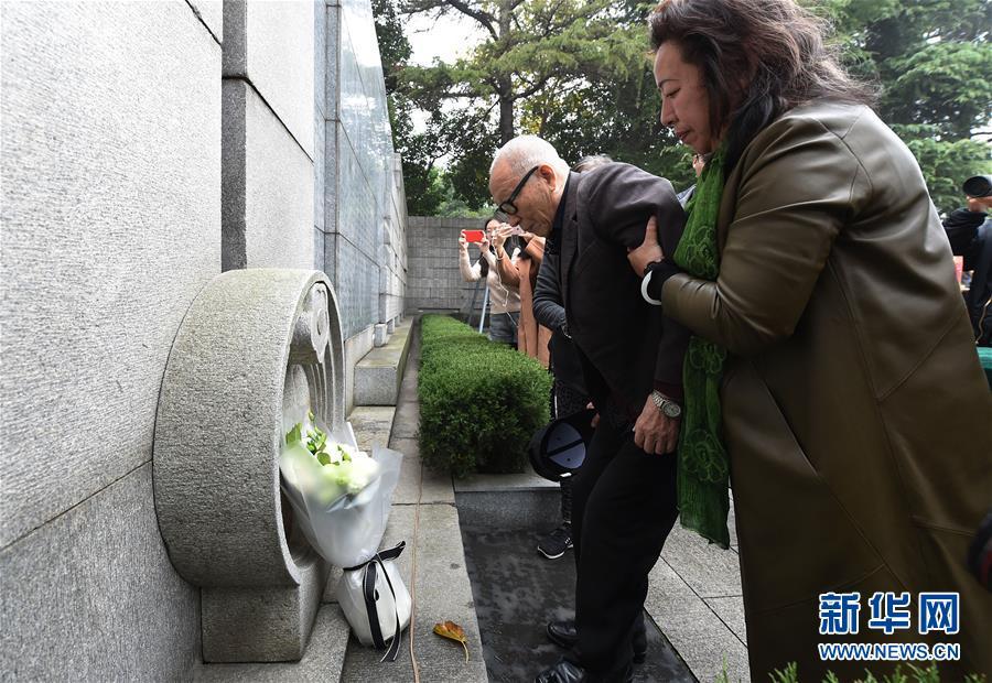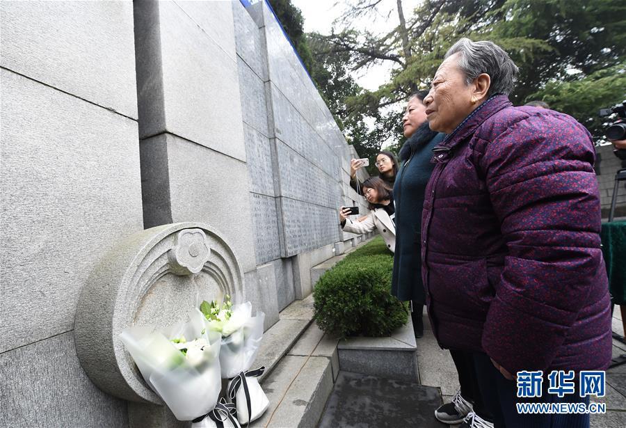 12月3日,南京大屠殺幸存者石秀英(右)率家屬在死難者名單墻前憑吊被侵華日軍殺害的親人。 當日,在第五個南京大屠殺死難者國家公祭日到來之際,南京大屠殺死難者遺屬家祭活動在侵華日軍南京大屠殺遇難同胞紀念館正式啟動。首批前來開展家祭活動的南京大屠殺幸存者余昌祥、石秀英老人分別率家屬在紀念館內的死難者名單墻前獻花、敬香、跪拜,并誦讀家信,表達對親人的哀思。 新華社記者 孫參 攝