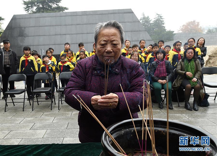 12月3日,南京大屠殺幸存者石秀英焚香祭奠被侵華日軍殺害的親人。 當日,在第五個南京大屠殺死難者國家公祭日到來之際,南京大屠殺死難者遺屬家祭活動在侵華日軍南京大屠殺遇難同胞紀念館正式啟動。首批前來開展家祭活動的南京大屠殺幸存者余昌祥、石秀英老人分別率家屬在紀念館內的死難者名單墻前獻花、敬香、跪拜,并誦讀家信,表達對親人的哀思。 新華社記者 孫參 攝