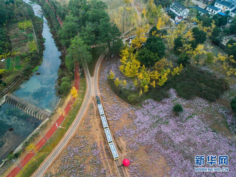 一列觀光小火車帶著游客穿行在銀杏林和花海之間(11月16日無人機(jī)拍攝)。近日,在浙江省長興縣小浦鎮(zhèn),“十里銀杏長廊”和近千畝花海經(jīng)過近一年的升級(jí)改造后,以嶄新的面貌與游客見面?;ê?、觀光小火車、古村民宿、銀杏長廊等旅游項(xiàng)目全面提升了小浦鎮(zhèn)鄉(xiāng)村旅游的品質(zhì)。新華社記者 徐昱 攝