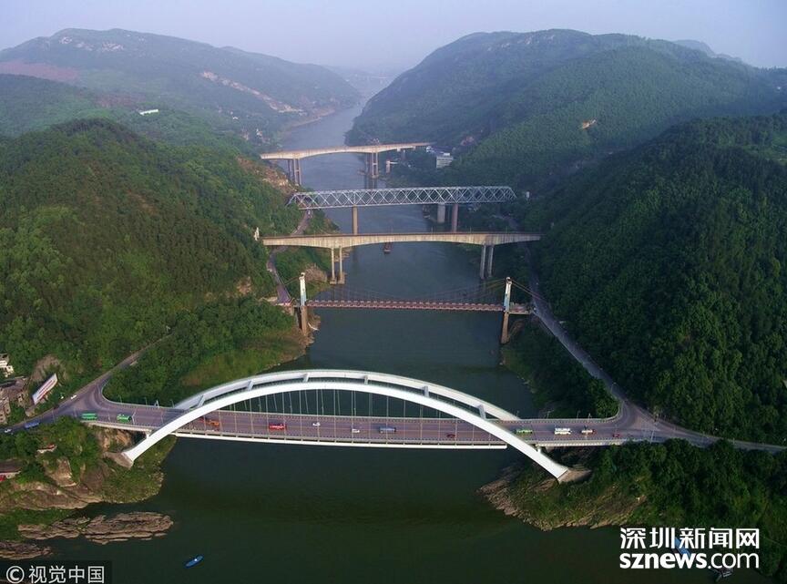 2018年5月18日,重慶,在嘉陵江重慶觀音峽段,間隔不到1000米的江面上橫跨著五座大橋,形成了五橋“疊翠”的美麗景觀,生動展示了“橋都”重慶的變化。