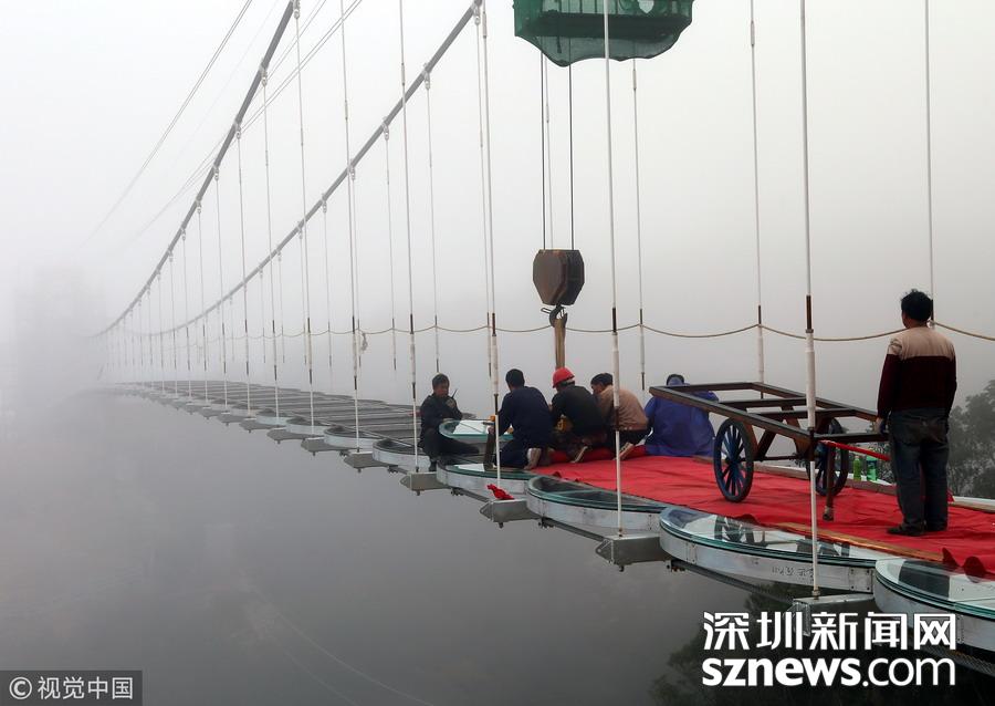 深圳新聞網(wǎng)訊 2018年12月3日,在浙江玉環(huán)市上棧頭玻璃吊橋建設(shè)工地上,工人們正在北端橋頭鋪設(shè)橋面4厘米厚的玻璃,預(yù)計46個箱梁的玻璃全部鋪設(shè)完成需到5日,然后再進入安裝兩側(cè)護欄和拉攀抗風(fēng)拉索,吊橋工程竣工定于23日,準備在2019年元旦試運行。