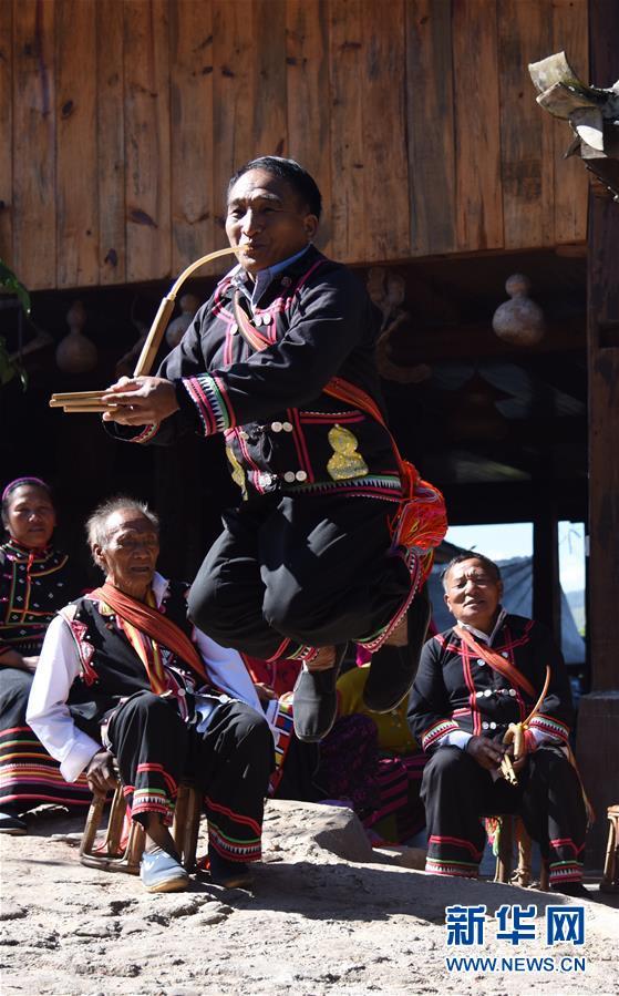 12月4日,在云南省瀾滄拉祜族自治縣酒井鄉(xiāng)勐根村老達(dá)保寨,拉祜族蘆笙舞傳承人李石開(kāi)在表演蘆笙舞。 新華社記者張瑞琪攝