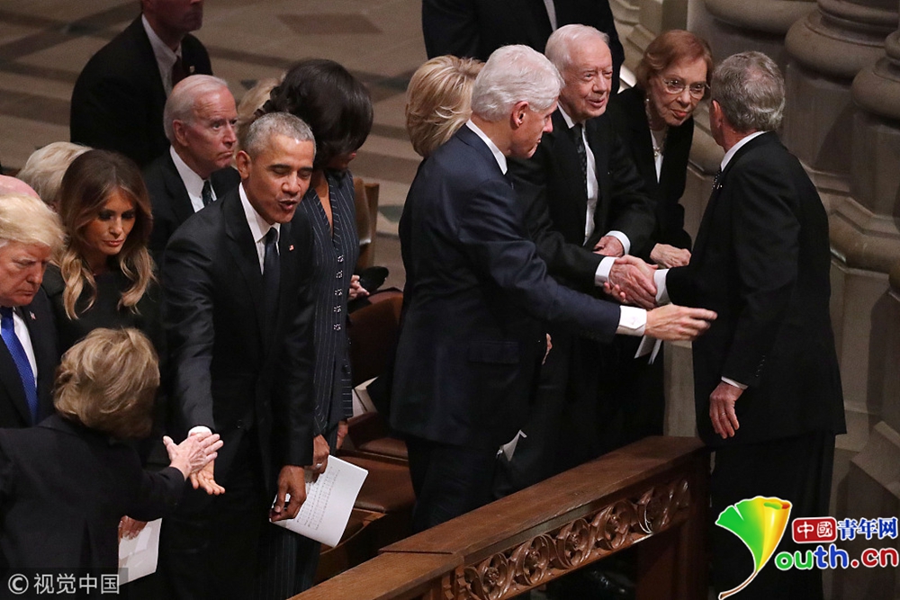 布什家族成員、現(xiàn)任總統(tǒng)特朗普、前總統(tǒng)奧巴馬等美國(guó)政界人士以及多名國(guó)際政要出席,為老布什送行。
