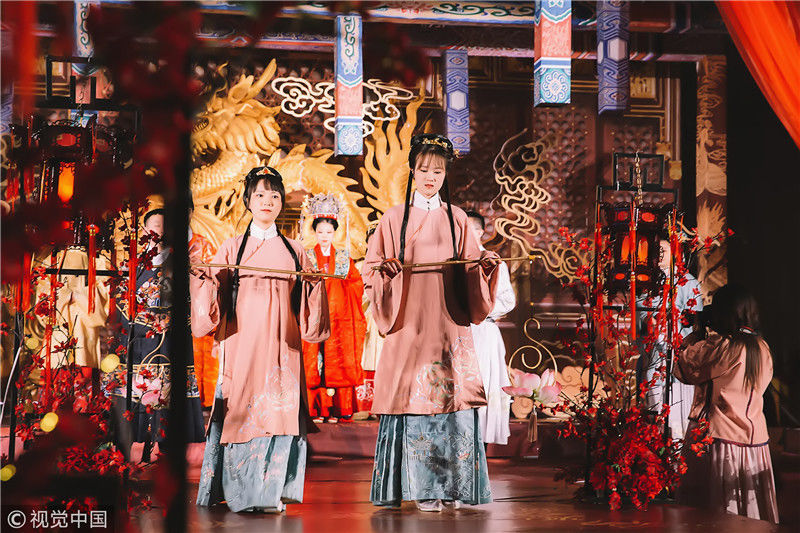 2018年11月18日,浙江嘉興?;槎Y開始,隨著一聲“新婿、新婦正婚大典開禮!掌燈!”兩名侍女提宮燈在前面開道,兩名執(zhí)事手捧大雁跟隨,然后是新人緊隨。新人身后是兩侍女手持沃盥用具,兩執(zhí)事持裝肉的食盤、酒壺,走在最后面。