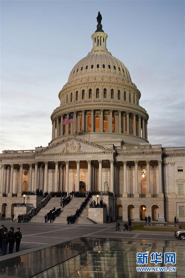 12月5日,在美國首都華盛頓,美國前總統(tǒng)喬治·赫伯特·沃克·布什的靈柩被安放在國會大廈前的靈車上。