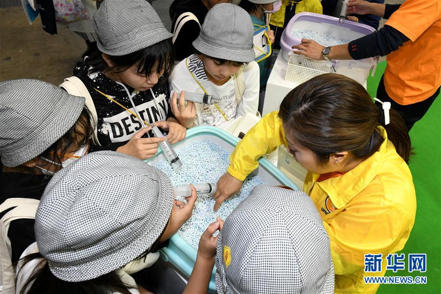 12月6日,在日本東京,小學生們參觀一種環(huán)保寵物用品。這種利用產(chǎn)業(yè)廢料制成的顆粒狀材料可以吸收寵物尿液并凝聚成團,方便清理。