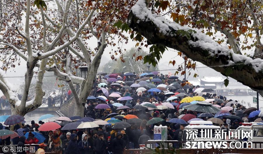 深圳新聞網(wǎng)訊 2018年12月8日,杭州,當(dāng)日市區(qū)普降大雪,市民和游客扎堆涌入西湖景區(qū),拍攝最美雪景照片以及為自己留影。每次杭州一下雪,斷橋便成為眾多游客欣賞雪景、拍攝雪景的地方,大家都想看看“斷橋殘雪”。游客們?cè)延咳霐鄻蚝?,人山人海,讓現(xiàn)場(chǎng)堪比春運(yùn)場(chǎng)景。因?yàn)槿颂?,雪積不起來(lái),斷橋看不到殘雪。
