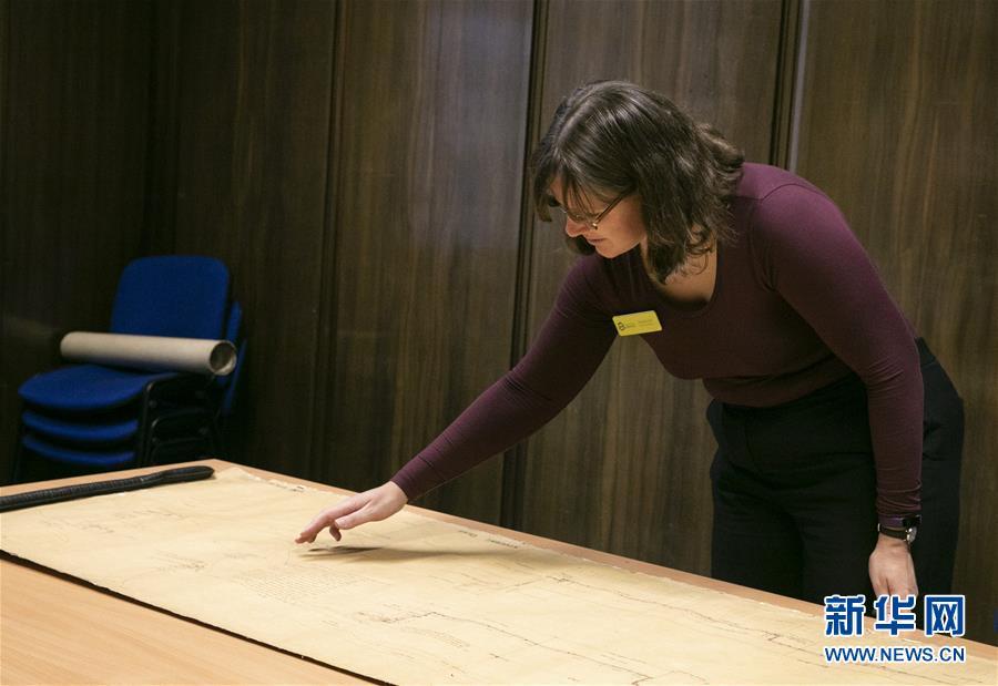 11月2日,在英國(guó)紐卡斯?fàn)柕奶┒鳌枡n案館,檔案管理員瑞秋·吉爾介紹致遠(yuǎn)艦設(shè)計(jì)圖紙。 新華社記者日前在紐卡斯?fàn)柼┒鳌枡n案館查找北洋海軍史料時(shí)發(fā)現(xiàn)一套七張、檔案名為“中國(guó)巡洋艦舵機(jī)設(shè)計(jì)圖”的原始圖紙。塵封百年,甲午海戰(zhàn)中抗擊日艦后沉沒(méi)的清北洋海軍致遠(yuǎn)艦部分原廠設(shè)計(jì)圖紙?jiān)谄浣ㄔ斓亍?guó)紐卡斯?fàn)柺械囊患覚n案館首次被發(fā)現(xiàn),為打撈那段悲壯的歷史提供了重要參考。 新華社記者 韓巖 攝