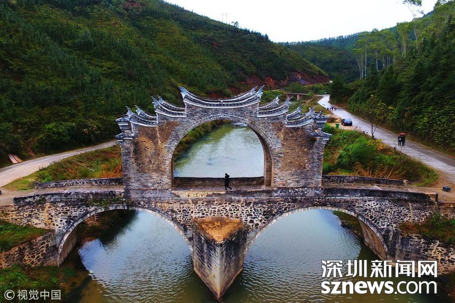深圳新聞網(wǎng)2018年12月12日訊 太平橋位于江西省龍南縣楊村鎮(zhèn)街道北面太平江上,為兩孔三墩、四拱雙層重疊組合石拱橋。全長50米,造型奇特,上有四通涼亭,以方便行人覽勝和憩息。始建于明正德年間,為全國重點保護文物保護單位。 劉占昆 (江西分社)/中新社/視覺中國