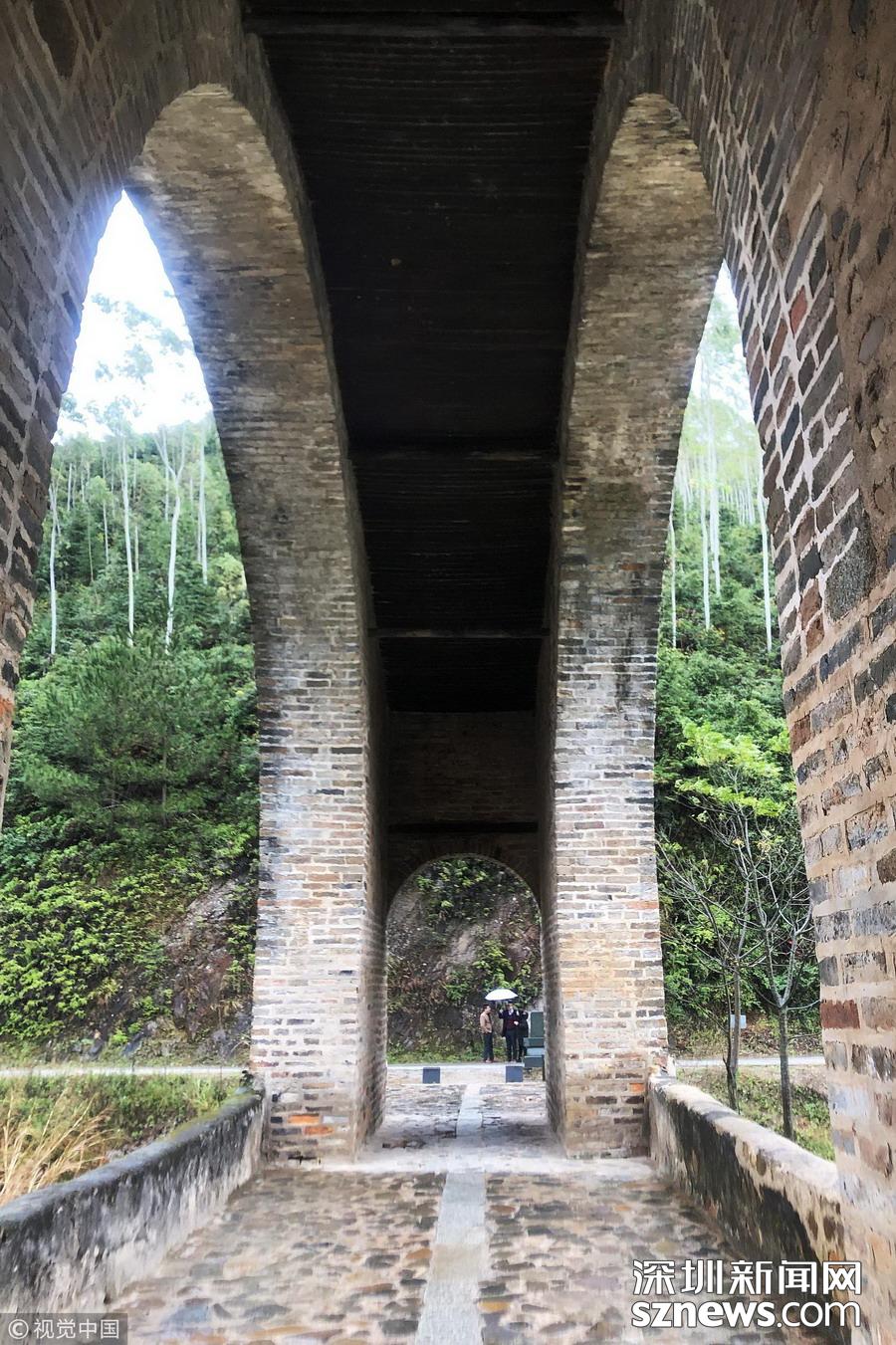 2018年12月9日,航拍位于江西省最南端龍南縣境內(nèi)的太平橋,游客行走在石拱橋上。