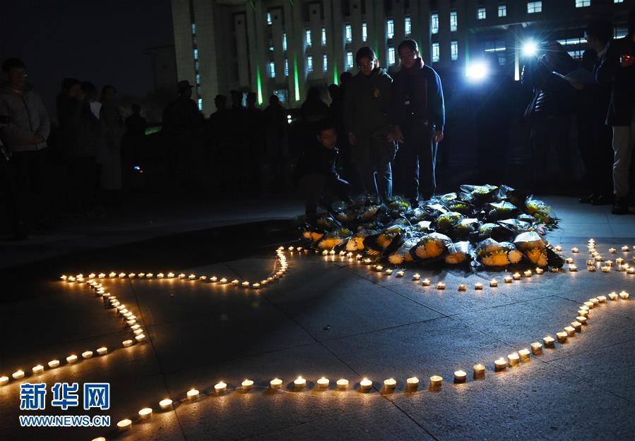 12月12日,學(xué)生將組成紀(jì)念圖案的白燭擺放整齊。 當(dāng)晚,南京東南大學(xué)學(xué)生在校園舉行“燭光祭”活動(dòng),悼念南京大屠殺遇難同胞。學(xué)生們點(diǎn)燃白燭,獻(xiàn)花默哀,表達(dá)哀思。 新華社記者 孫參 攝