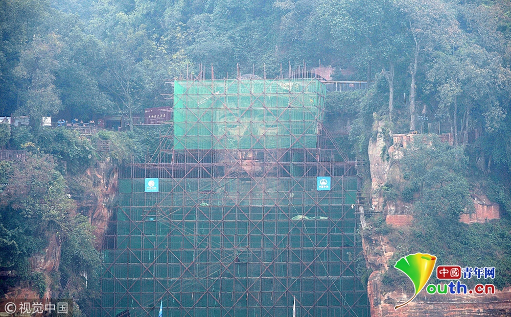 12月13日,四川樂山大佛周圍搭建腳手架已經(jīng)到達大佛頭部,10多名工人穿梭于搭建的腳手架之間,工人用綠色防護網(wǎng)繞腳手架將大佛圍住。從2018年10月8日截至今日,經(jīng)過66天的緊張施工,用了近兩千根6米長鋼管搭建腳手架,搭建的腳手架總重量達45噸,鋼管的總長度加起來達到11700米,而圍在腳手架外的防護網(wǎng)則使用了2000平方米左右。目前,包括頭部在內(nèi)的樂山大佛本體已被全部遮蔽。
