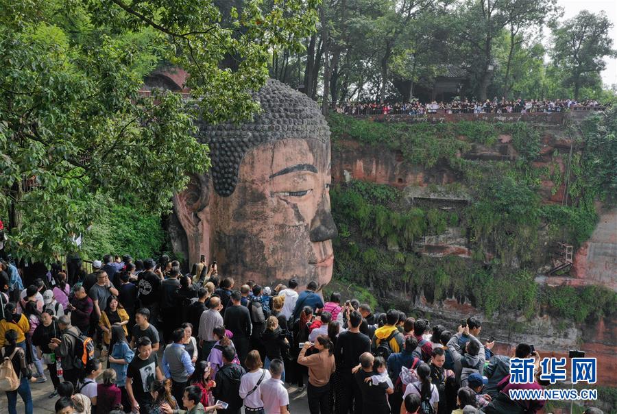 10月4日,游客在樂山大佛前排隊一睹大佛真容(無人機拍攝)。 新華社記者 江宏景 攝