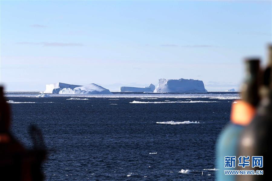 從“雪龍”號極地考察船上拍攝的普里茲灣海域冰山群(11月29日攝)。 新華社記者 劉詩平 攝