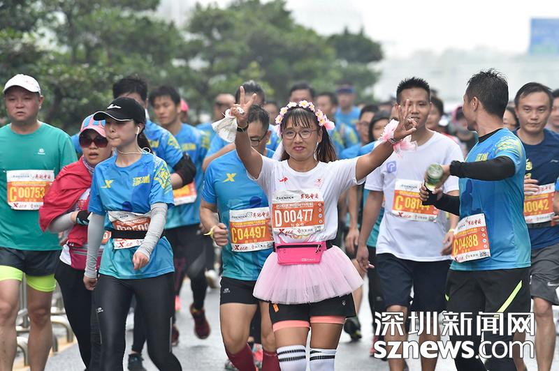 2018年12月16日,深圳國際馬拉松位于后海的折返點(diǎn),一名選手正在向終點(diǎn)沖刺,并向鏡頭招手。