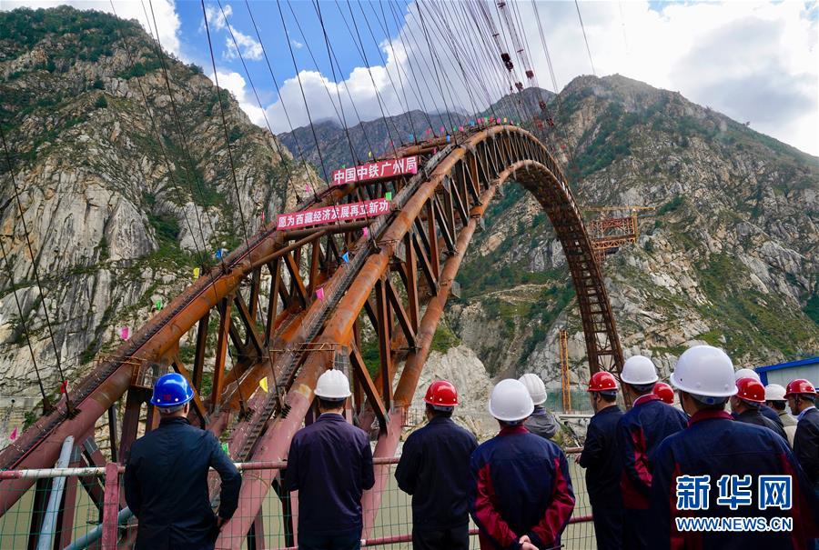 9月28日拍攝的川藏鐵路拉林段重點標志性工程藏木特大橋合龍儀式現(xiàn)場。 當(dāng)日,隨著最后一節(jié)鋼管拱的對位和鎖定完畢,川藏鐵路拉林段藏木特大橋成功合龍,標志著大橋主體結(jié)構(gòu)施工取得了關(guān)鍵性勝利。藏木特大橋由中國中鐵廣州局集團承建,拱高112米,橋橫跨雅魯藏布江峽谷,水深66米。 新華社記者普布扎西攝