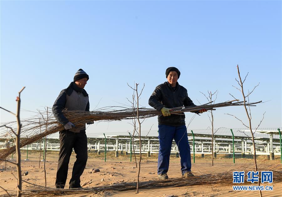 12月13日,位于庫布其沙漠腹地的達拉特光伏發(fā)電應(yīng)用領(lǐng)跑基地一期500兆瓦項目中,工人用柳枝制作固沙帶。 新華社記者 彭源攝