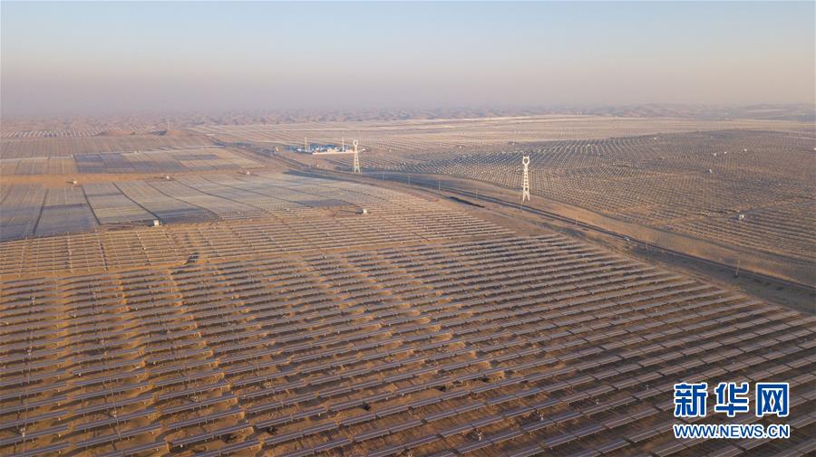 位于庫布其沙漠腹地的達拉特光伏發(fā)電應(yīng)用領(lǐng)跑基地一期500兆瓦項目(12月13日無人機拍攝)。  新華社記者 彭源攝