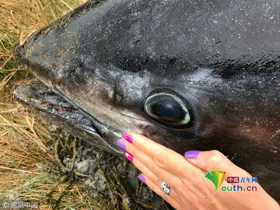 比人還大!狂風(fēng)暴雨后2米長(zhǎng)巨型藍(lán)鰭金槍魚擱淺沙灘
