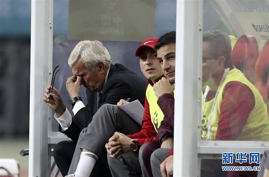 圖為2018年3月22日,中國隊主教練里皮(左一)在2018中國杯國際足球錦標(biāo)賽中球隊失球后的資料照片。 新華社記者曹燦攝