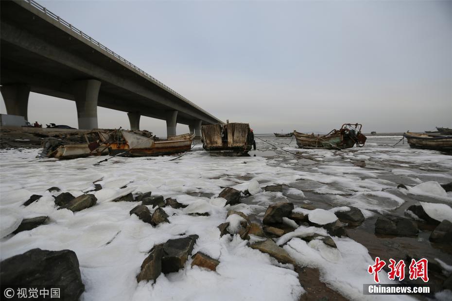 12月9日,受大風(fēng)降溫天氣影響,青島膠州灣北部冰情初現(xiàn),青島西海岸新區(qū)膠州灣跨海大橋入口處海冰層層疊疊,暫未對海上漁業(yè)生產(chǎn)帶來影響。張進(jìn)剛 攝 圖片來源:視覺中國