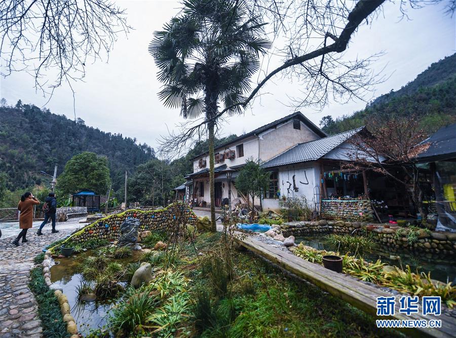 12月19日,客人走進(jìn)民宿“僻地寒樓”。該民宿共有7幢風(fēng)格各異的小屋分布在山坡上,頗具特色。河橋鎮(zhèn)青年張雁辭去了上海的工作,回到家鄉(xiāng)開(kāi)辦了這家民宿。 新華社記者 徐昱 攝