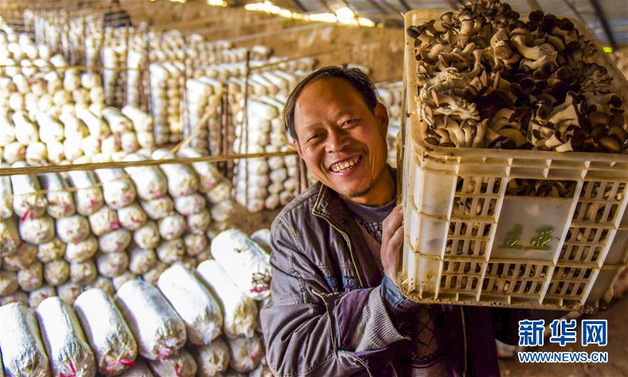 11月18日,在衡水市冀州區(qū)周村鎮(zhèn)東高村食用菌種植基地的大棚里,村民在搬運蘑菇。