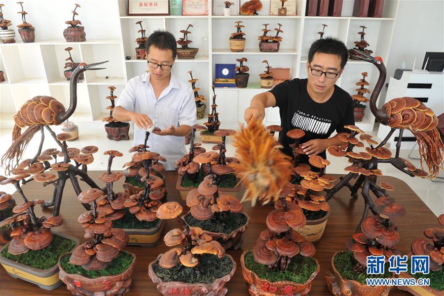 9月4日,韓子南(左)和韓子夜在打理靈芝盆景。