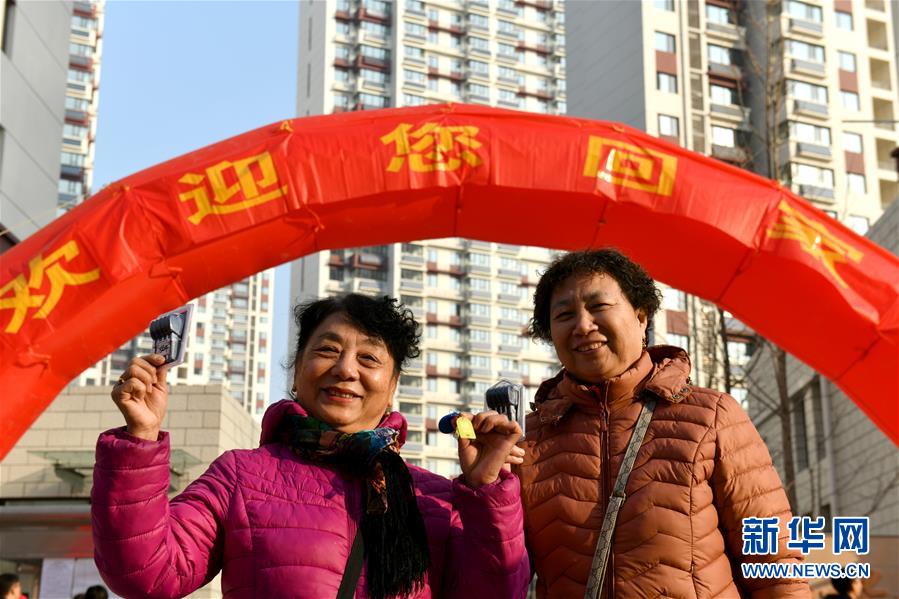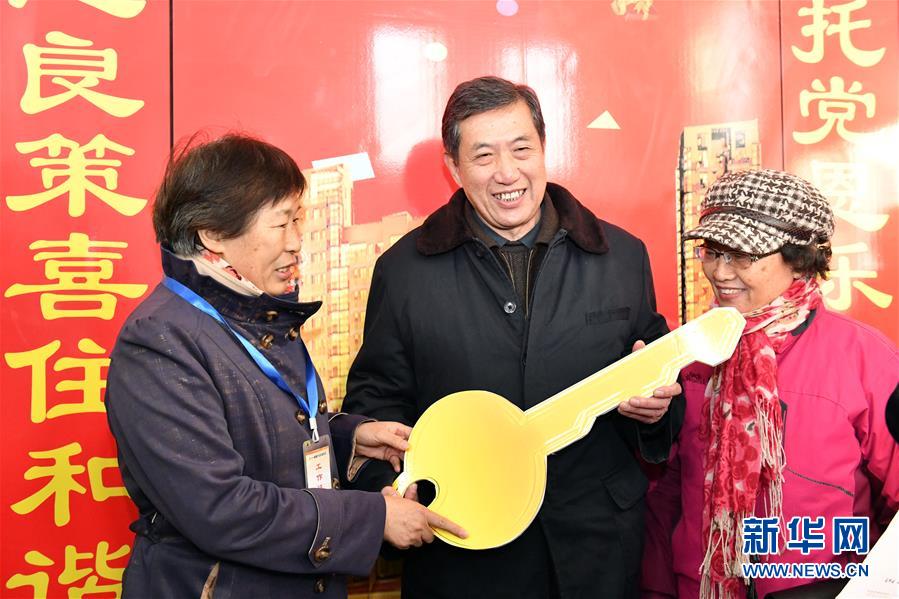 12月20日,回遷居民遲明德(中)成為和諧佳苑小區(qū)第一位辦理回遷入住的居民。 當日,濟南市槐蔭區(qū)經十一路棚戶區(qū)改造項目——和諧佳苑小區(qū)正式交付居民回遷安居。作為濟南市槐蔭區(qū)頭號民生工程,本項目共17棟安置樓,實現(xiàn)棚戶區(qū)居民“出棚進樓”,改善安居環(huán)境。 新華社記者 郭緒雷 攝
