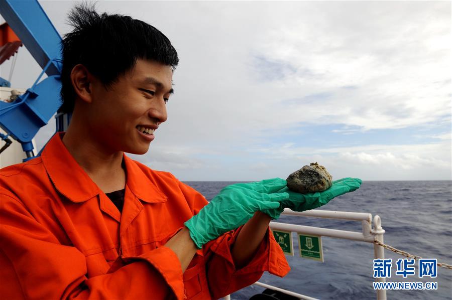 科考團(tuán)隊(duì)成員林剛展示在泥火山采集到的蛇紋石樣品(12月20日攝)。