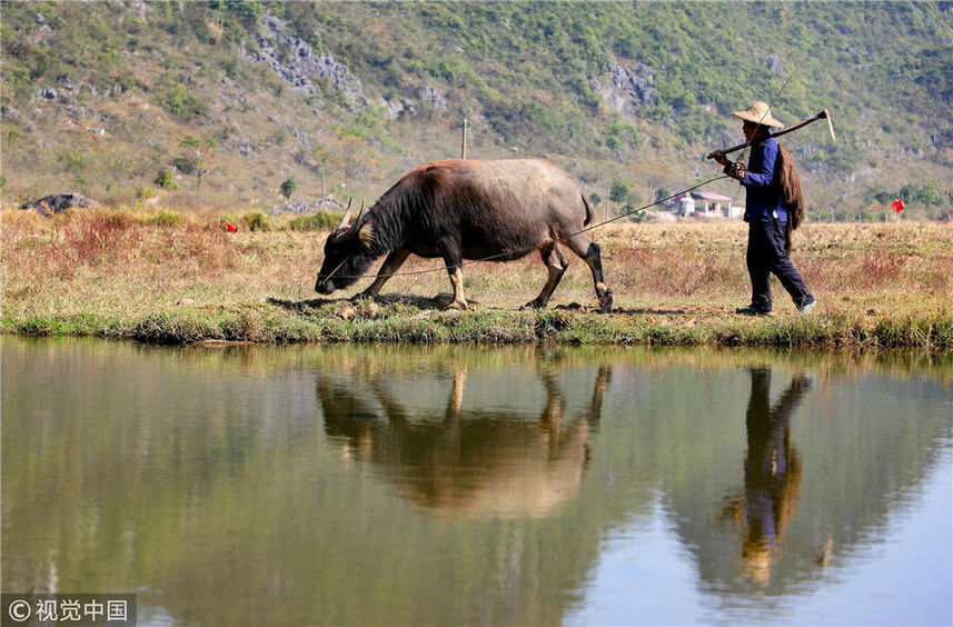 12月17日,在廣西桂林的臨桂區(qū)田心村這座叫做狀元橋的小橋上,剛吃過(guò)午飯,老許和他的水牛搭檔又要開始一場(chǎng)生態(tài)演出了。