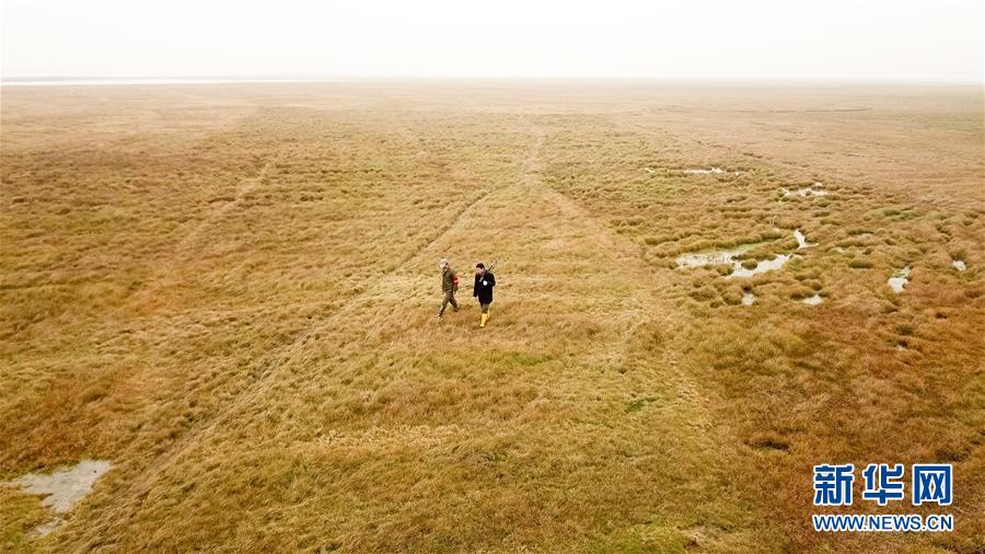 12月22日,王三益(右)和生態(tài)保護(hù)協(xié)會成員江軍在菜子湖濕地進(jìn)行越冬候鳥巡護(hù)(無人機拍攝)。每年10月開始,候鳥遷徙至菜子湖,次年3月飛回北方,期間王三益會和協(xié)會成員開展越冬候鳥巡護(hù)以及清理濕地灘涂垃圾。