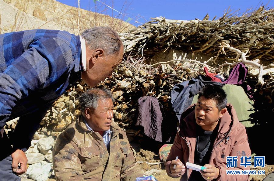 楚魯松杰鄉(xiāng)衛(wèi)生院院長(zhǎng)次仁頓珠(右)為楚魯松杰鄉(xiāng)巴卡村卡熱組阿孜冬季牧場(chǎng)的牧民送藥(12月22日攝)。