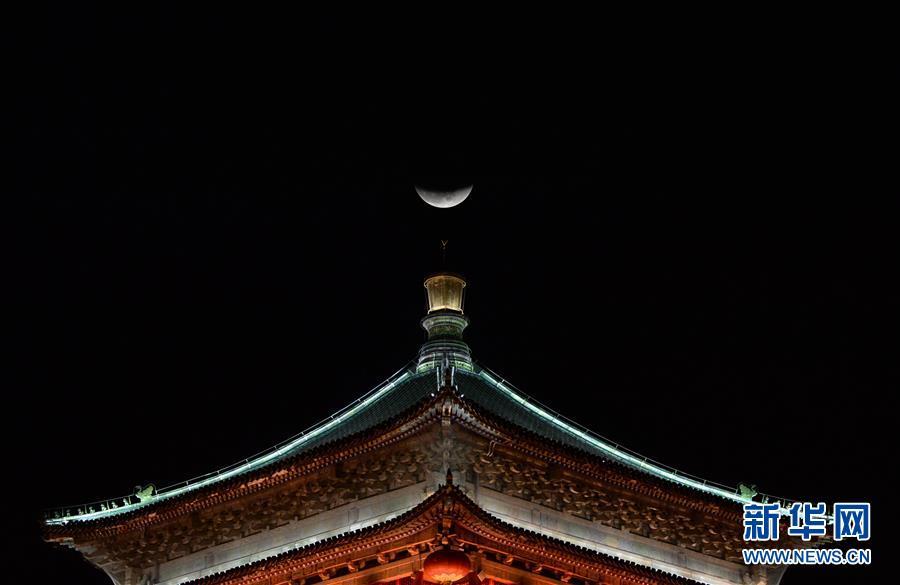 這是1月31日在陜西省西安市鐘樓拍攝的月亮。 在即將過去的2018年,各地?cái)z影師用鏡頭記錄下四季中國。大江南北,一幅幅色彩斑斕的美麗畫卷徐徐展開。 新華社記者 李一博 攝