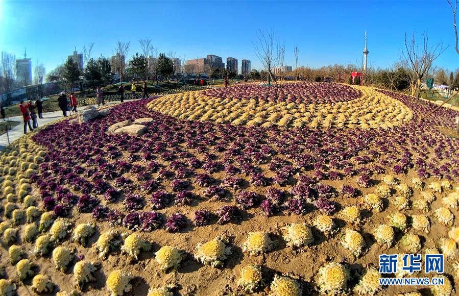 12月24日,游人在北京玉淵潭公園觀賞甘藍(lán)。 日前,北京市玉淵潭公園移栽的三萬多棵紫色和黃色羽衣甘藍(lán)盛開,為冬季公園增添了色彩。 新華社記者李欣攝
